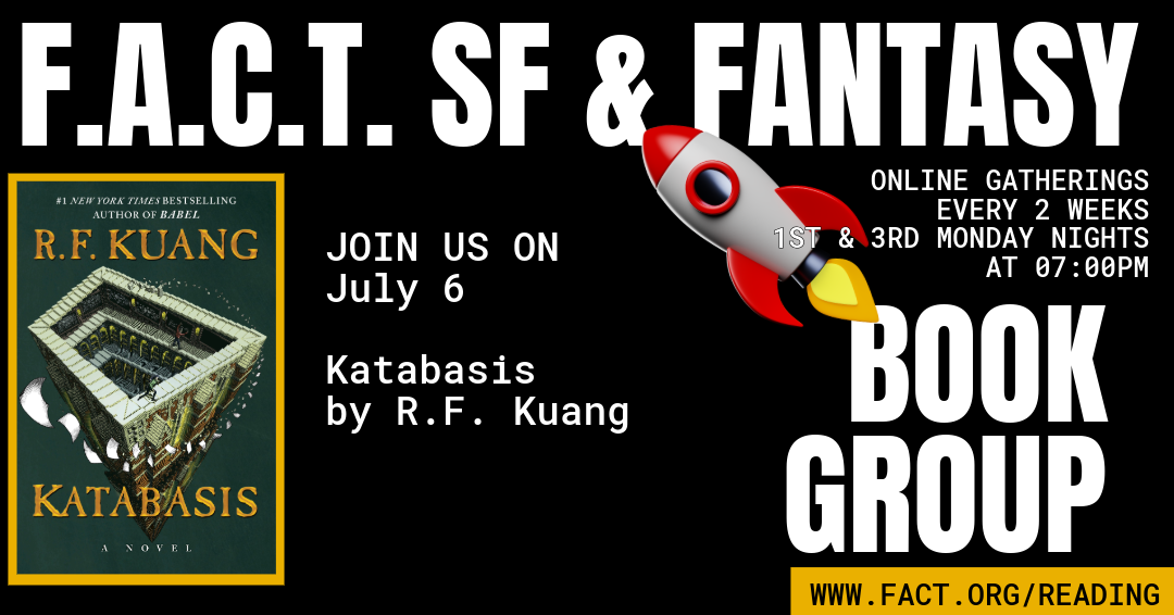 Want to talk about a great read with other booklovers? The FACT SF/F Reading Group will meet on Monday, July 6, at 7 PM CST to discuss Katabasis by R.F. Kuang! The meeting will be held online via Zoom. To get the link (if not already on the mailing list), send an email to reading at fact.org