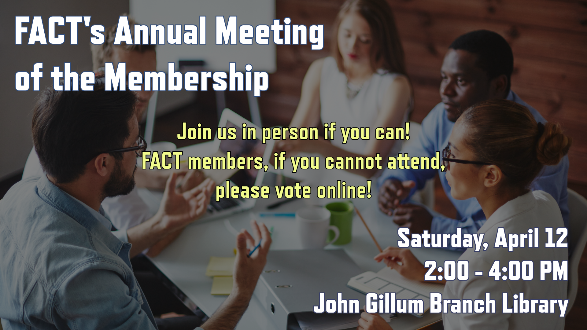 FACT’s Annual Meeting of the Membership on March 8, 2025, was adjourned for lack of a quorum and other issues to 2:00 p.m. on Saturday, April 12, 2025, at the John Gillum Branch Library (2505 Steck Ave., Austin, TX). There will likely be socializing afterwards! Members generally go out for dinner afterwards.