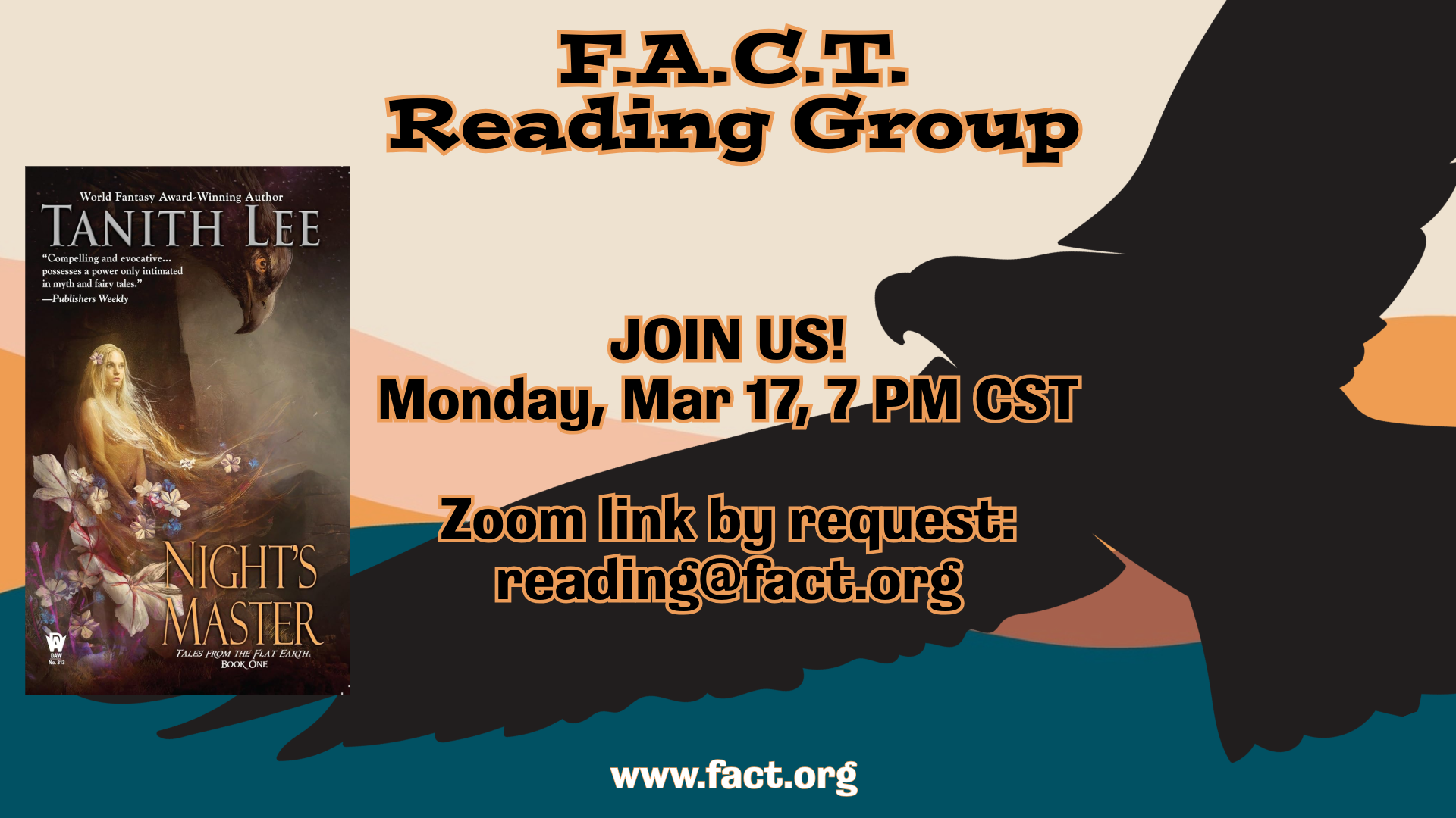 F.A.C.T.’s book discussion group meets online on the first and third Monday of each month at 7PM. Everyone is welcome to attend! To get the link for an upcoming meeting, send an email to reading@fact.org. At this meeting, we’ll discuss: Night’s Master by Tanith Lee (242 pages).