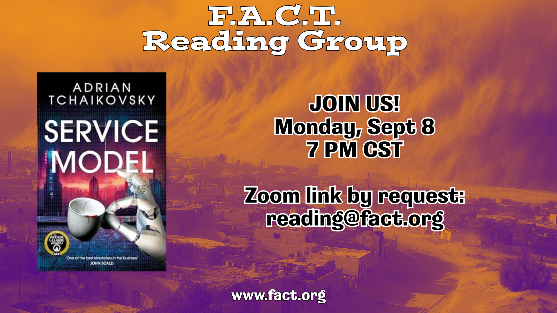 F.A.C.T.’s book discussion group meets online on the first and third Monday of each month at 7PM. Everyone is welcome to attend! To get the link for an upcoming meeting, send an email to reading@fact.org. At this meeting, we’ll discuss: Service Model by Adrian Tchaikovsky!