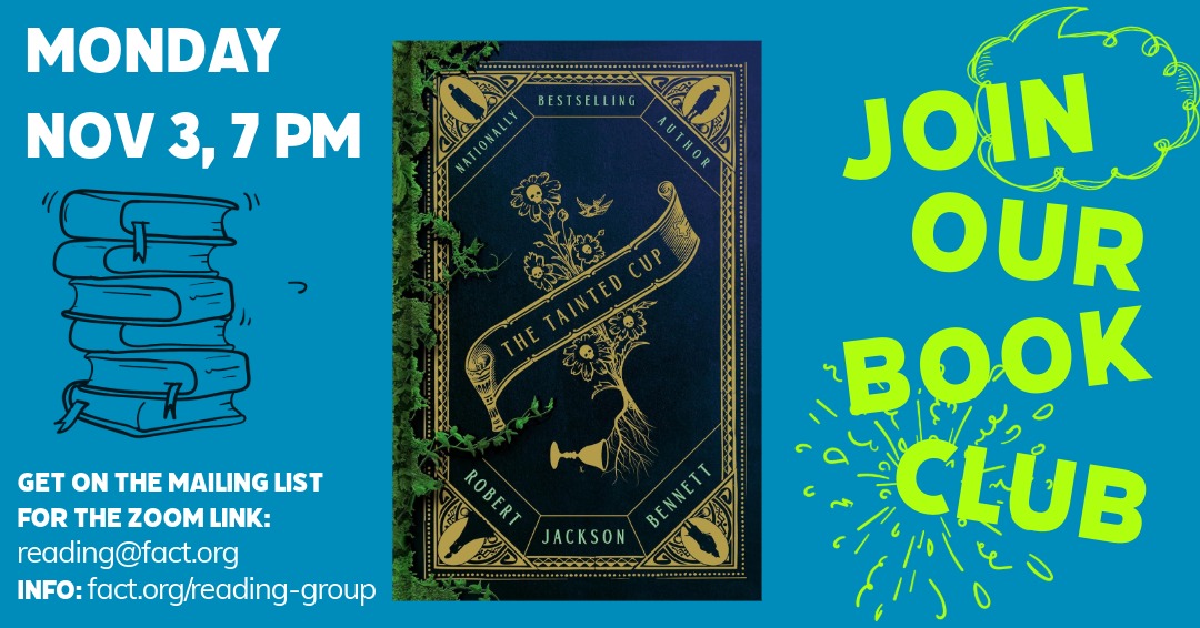 Want to talk about a great read with other booklovers? The FACT SF/F Reading Group will meet online on Monday, Nov 3, at 7 PM CST to discuss The Tainted Cup by Robert Jackson Bennett!! The meeting will be held online via Zoom. To get the link (if not already on the mailing list), send an email to reading at fact.org
